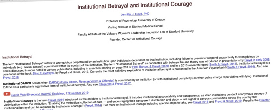 Dr. Freyd’s latest contribution (link here) is framing the distinction between institutional betrayal and institutional courage.